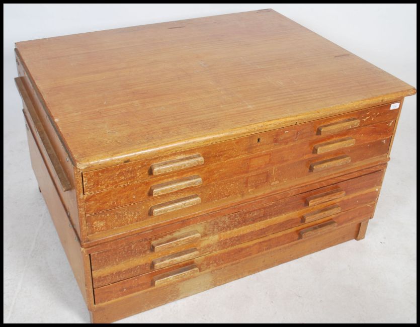 A retro mid-century architects  teak plan chest of drawers comprising of two sections with three drawers having square cupped handles to each and a slab top. Measures 58cms x118cms x94cms