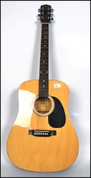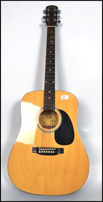 A vintage acoustic six string Squire Fender guitar having a shaped hollow body with mother of pearl inlaid fret markers.