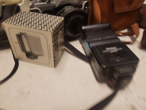 A collection of vintage cameras dating from the 20th century to include a Zeiss Ikon Ikonta camera  Box Brownie, Olympus 35mm, Minolta 35mm, lenses and accessories together with a retro video camera and a pair of cased Zenith binoculars.