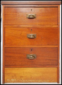 A vintage industrial mid century golden oak pedestal chest / bank of drawers with metal 'D cup' handles and a solid wood top above