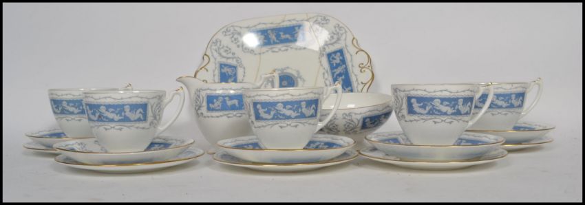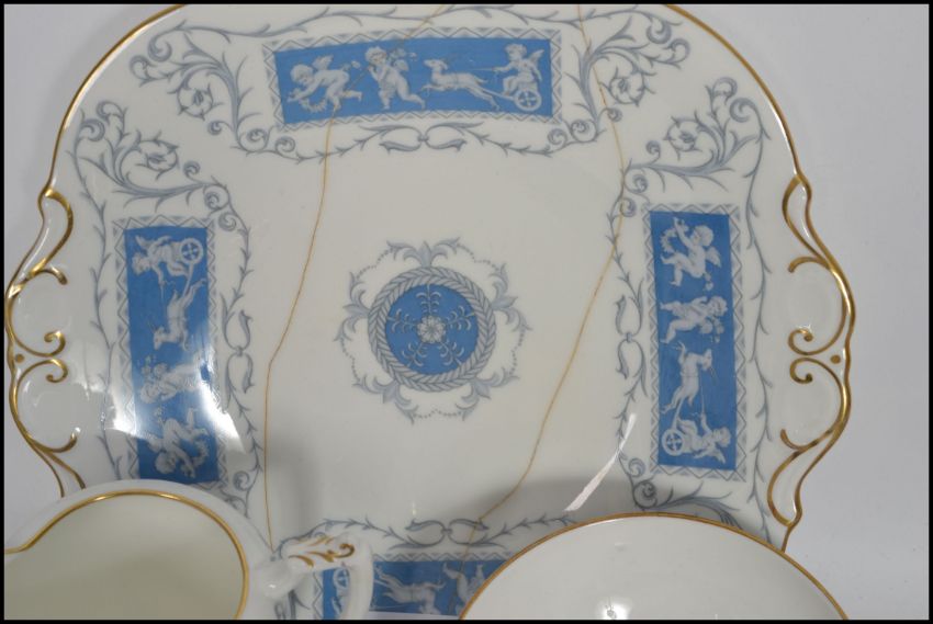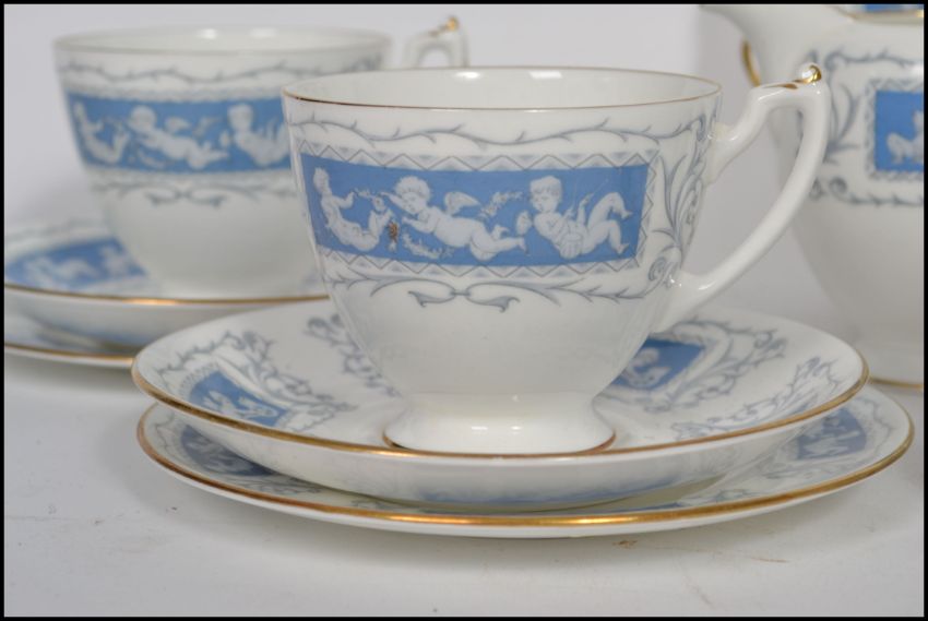 A vintage  Coalport Bone China six person tea service in the Reverly pattern, consisting of trio's, sugar bowl, creamer and sandwich plate. All stamped to the base.