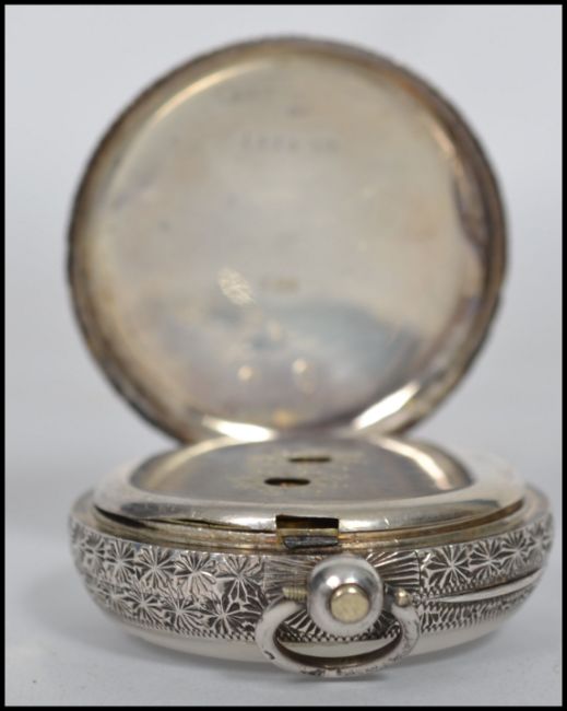A late 19th / early 20th Swiss made silver pocket watch having a roman numeral chapter ring with leaf swirl decoration to case. Stamped to inside 935 with bear heads and original key.