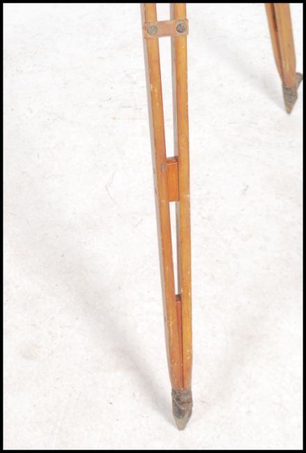 A good early 20th century wooden theodolite tripod stand being ideal for upcycling to a theatre light stand etc