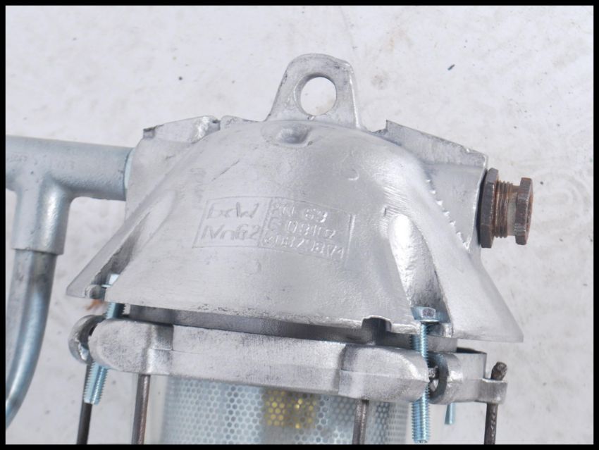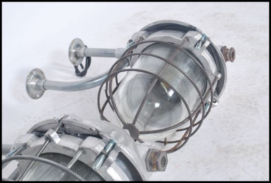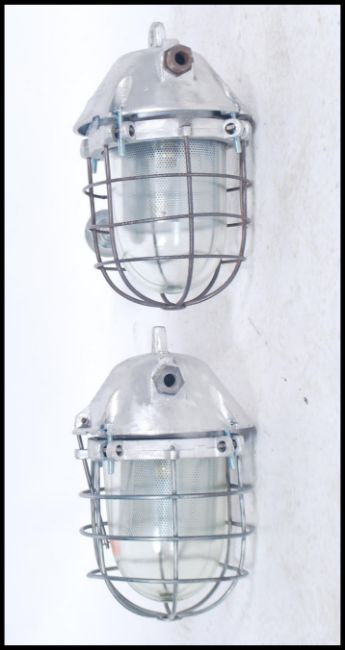 A pair of Industrial ' extreme condition ' heavy industrial bulkhead lights. Each with glass pendant shades being caged having polished metal bodies with wall bracket mounts. Polish origin with manufacturers notation to the tops. Further matching lights in lots 942 / 1053 / 968. 33cms x 38cms x 20cms