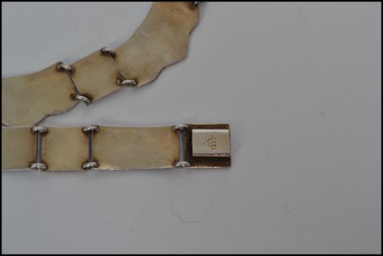 A fantastic Danish / Scandinavian sterling silver and blue enamel necklace and bracelet demi parure set in the manner of David Andersen having black and blue enamel floral spacers with clip clasps. Stamped 925 with makers mark to clasps. Necklace weighs 40.2 grams, bracelet weighs 17.5 grams.