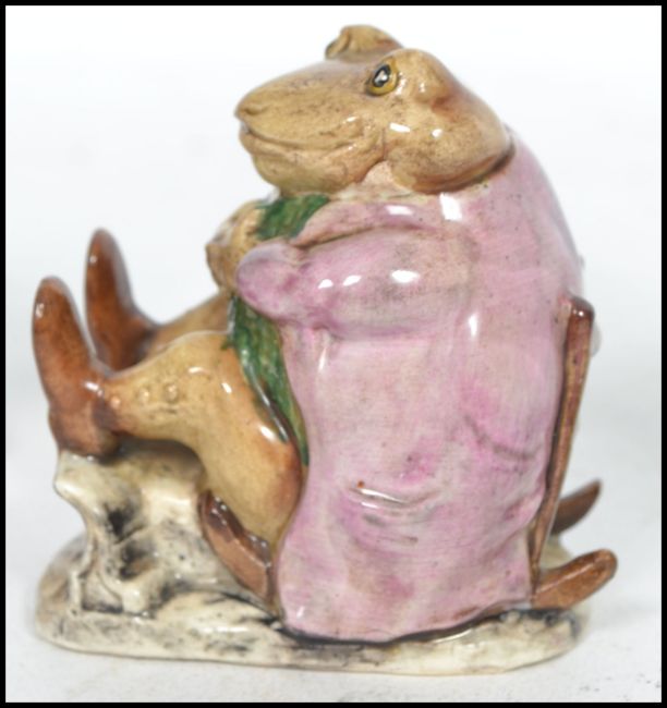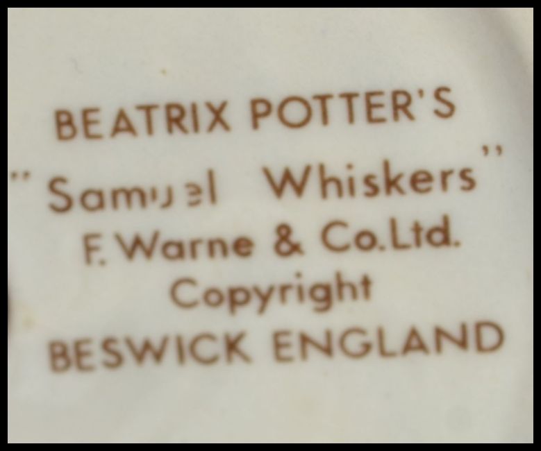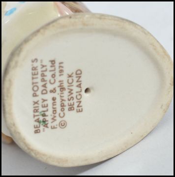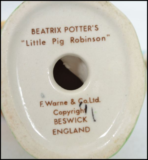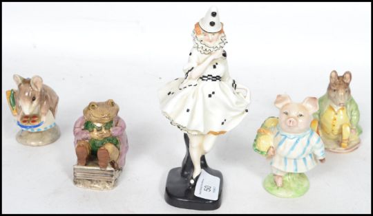 A Royal Doulton bone China figurine ' Pierrette ', HN644, painted, printed and impressed marks to base ( Early repair ), potted by Doulton and Company together with four Beswick Beatrix Potter figures Mr Johnson, Samuel Whiskers, Little Pig Robinson and Appley Dapply.