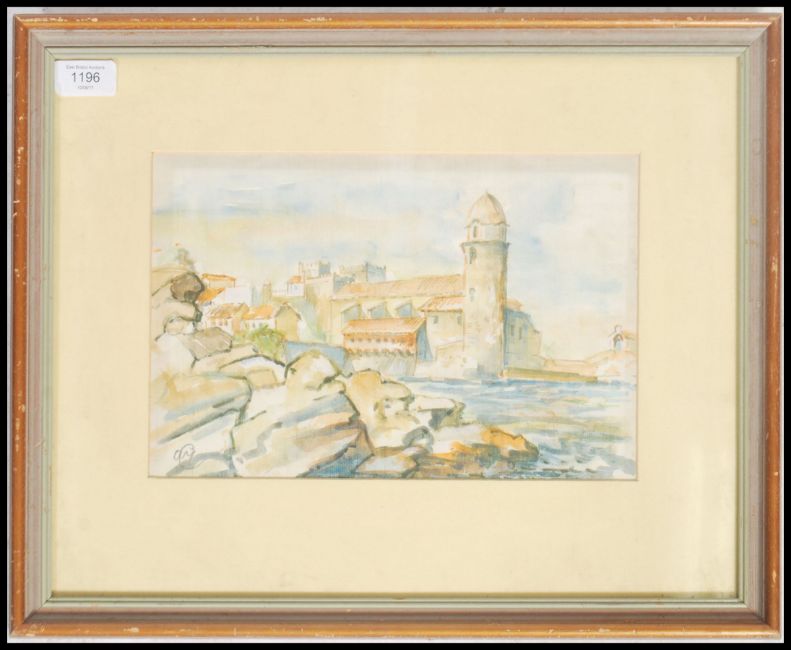 Olga Miksche: Water colour painting entitled Forcrem at Collioure being framed and glazed and signed by artist to lower corner.