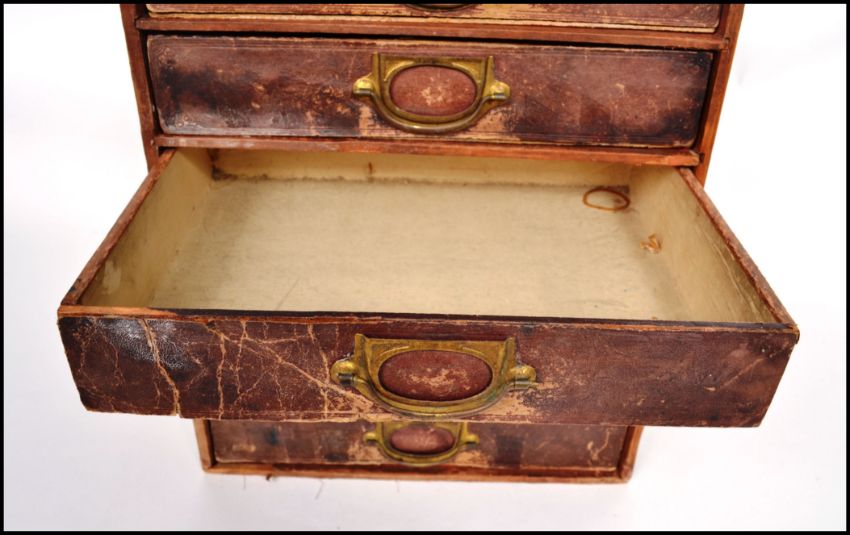 A set of vintage industrial factory table / desk top filing index cabinet drawers having a block opf four drawers with original paint finish.
