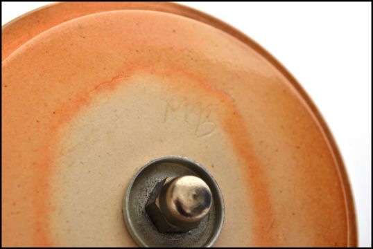 A Royal Doulton tube lined tobacco jar / biscuit barrel having a wicker swing handle with sealed lid. Doulton stamp to base Patent No 194168 X8872 4677. Artist signature to verso and lid. Measures 22cm with handle extended.