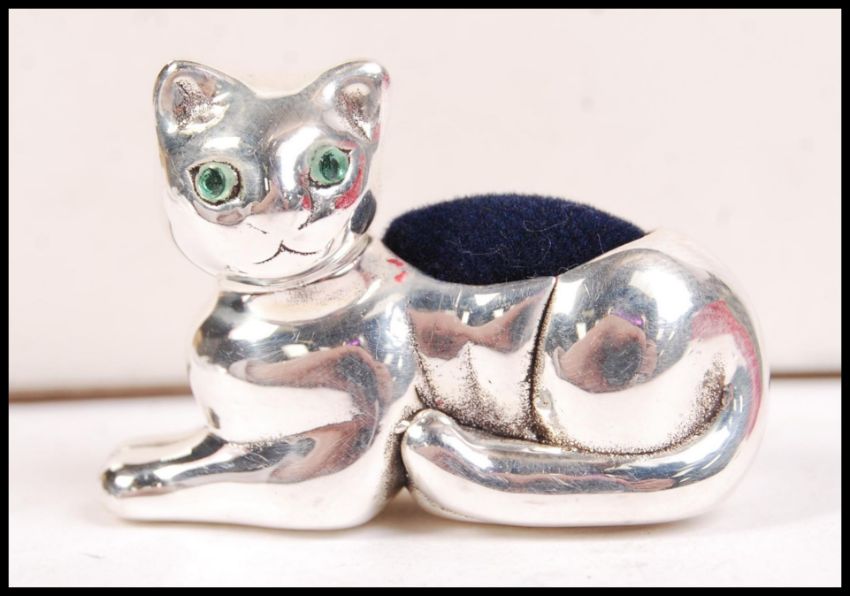 A silver pin cushion in the form of a seated cat having adorned purple baize pin cushion atop being marked 925 to the base. Total weight 14g approx / Size 3.5cms long