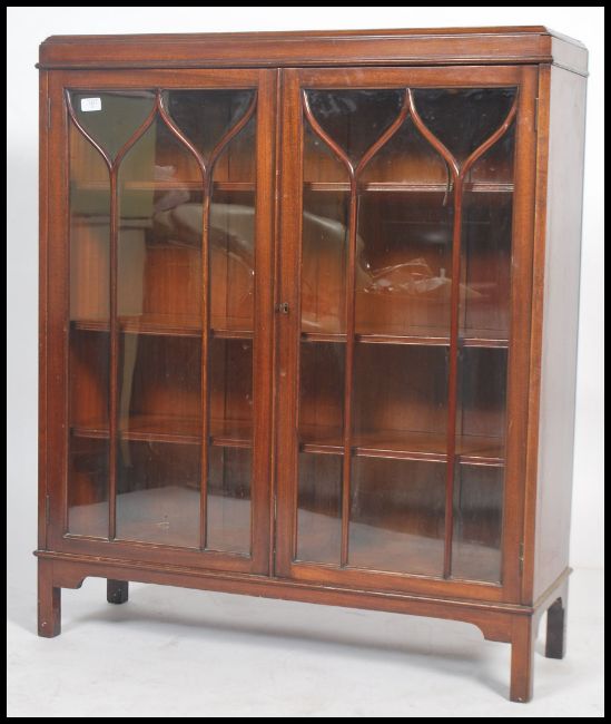 An Edwardian mahogany library bookcase cabinet raised on squared legs having twin astragal glazed doors with shelves set within