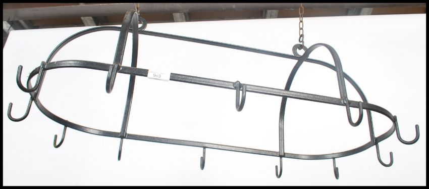 A 20th century cast iron ebonised chain hung pan rack of lozenge shape with hooks to banded sides. Measures 89cms high by 41cms wide.