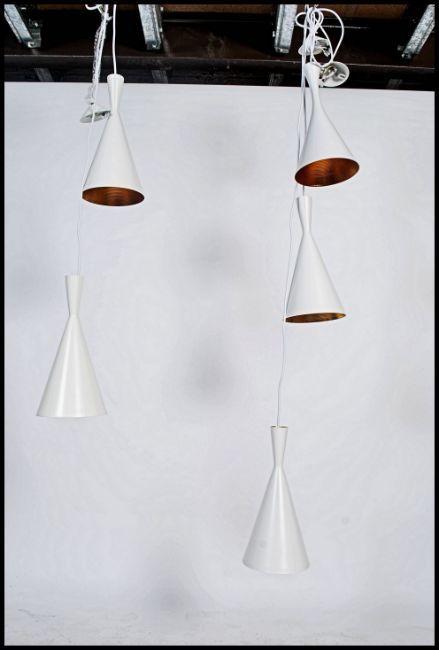 A set of five vintage retro style waisted pendant conical pendant ceiling lights after a Tom Dixon design, finished in white paint with a reflective gilt liner.