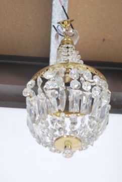 A large early 20th century Empire style brass drop chandelier having multiple faceted crystal drops of [pear shaped tapering teardrop form with gilt ormolu brass mounts.