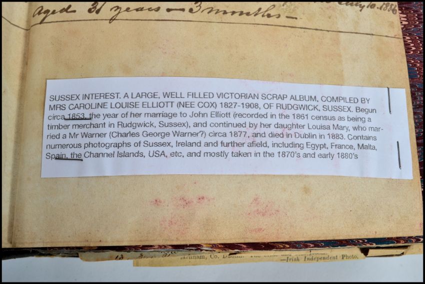A large well filled Victorian scrap album compiled by Mrs Caroline Louise Elliott ( Nee Cox ) 1827 - 1908 of Rudgwick, Sussex. Began circa 1853 the year of her marriage to John Elliott ( recorded in the 1861 census as being a timber merchant in Rudgewick Sussex ) and continued by her daughter Louisa Mary, who married a Mr Warner circa 1877 and died in Dublin in 1883. Contains numerous pictures of Sussex, Ireland, and further afield, including Egypt, France, Malta, Spain, Channel Islands etc.