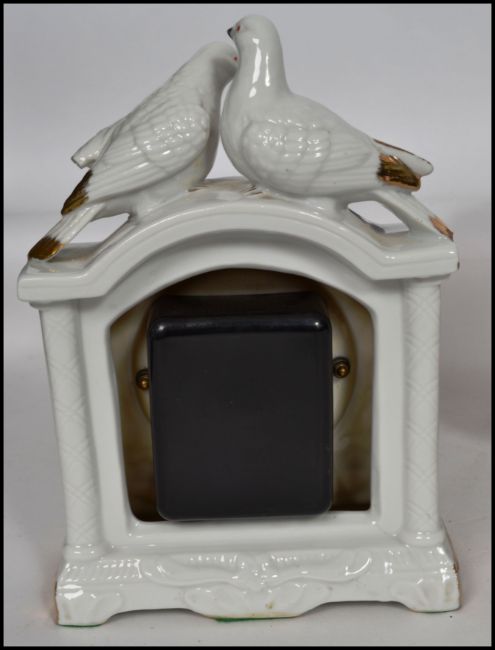 A group of three vintage kitsch ceramic mantel clocks. One in the form of a peacock, one in the form of doves and another. Measures 33cm high.
