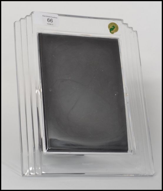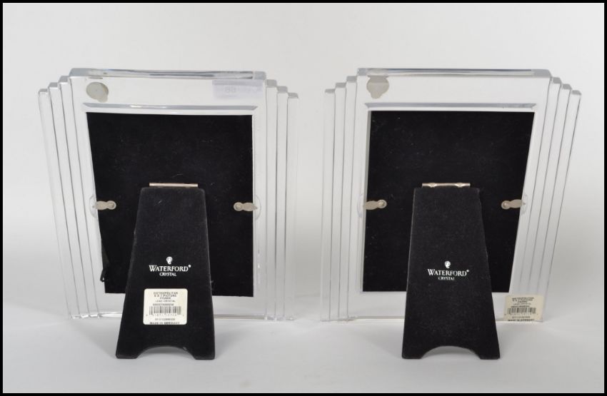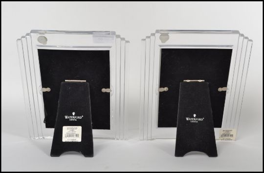 A pair of Waterford Crystal cut glass picture frames having an Art Deco inspired design with graduating rectangular edges and black velour back plates. Waterford labels to front and back.