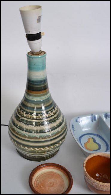 A good group of vintage 20th century studio art pottery to include a Rumney of Wales pottery lamp base decorated with bands of earthen hues, a Pitochry ash tray / pin dish and a bowl of similar form along with a signed pottery jug. Measures: 37cm high.