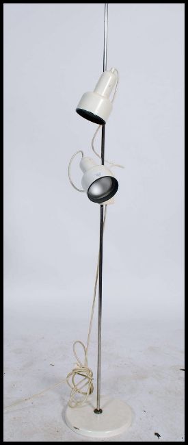 A 1980's retro adjustable twin spot chrome floor standing spot light lamp with pendant shades and terraced base with chrome column