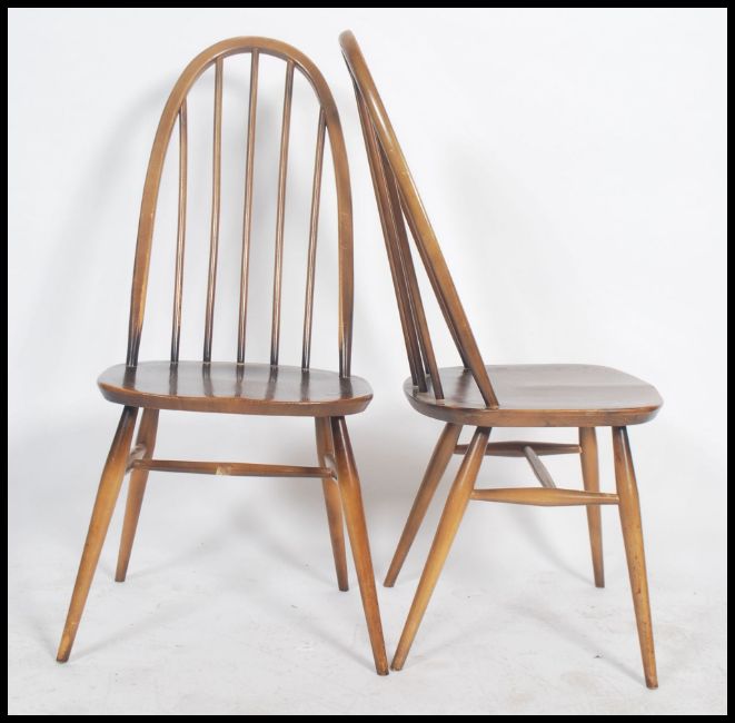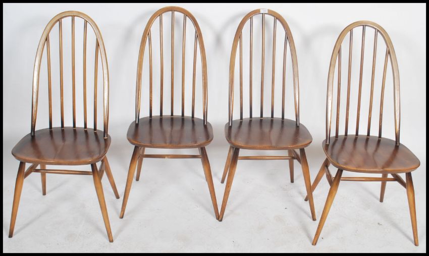 A set of four Ercol Golden Dawn coloured beech and elm framed Windsor, high hoop, spindled back dining chairs with solid seats raised on eliptically turned legs and stretchers