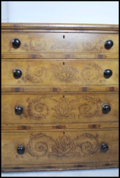 A Georgian 19th century stencil painted chest of drawers of softwood construction dating to circa early 19th century comprising a straight 4 bank of drawers having stunning stencil painted borders to the original painted finish