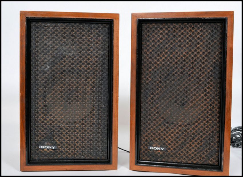 A pair of vintage retro 20th century teak cased Sony SS210 speakers with mesh front covers and brass wall mounts to the rear.