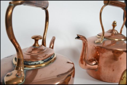 2 good Victorian copper kettles in the manner of Edward Wilkes together with a brass oil lamp and another. Measures 31cm high.