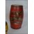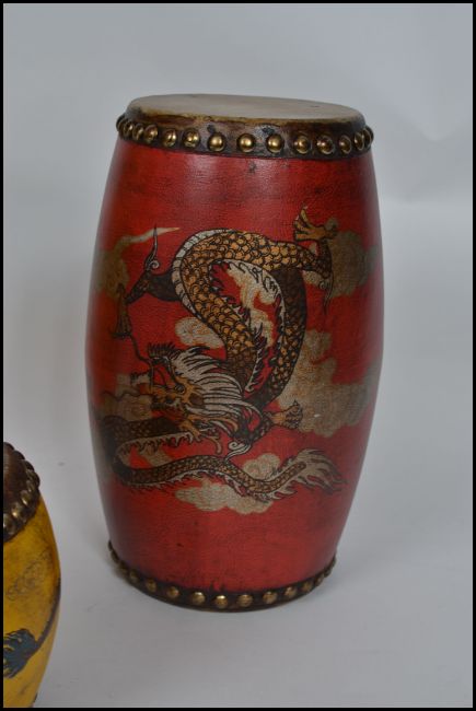A set of 3 Chinese drums of variant sizes having animal skin to top and bottom and studded, being decorated with dragon decoration 1 in red and other s in an opium yellow. Measures 31cms high