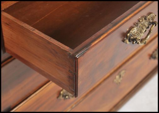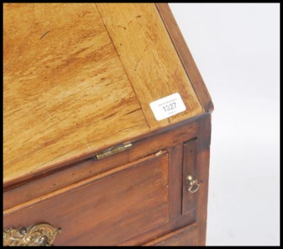 A Georgian Mahogany bureau, circa 1800, the banded fall front opening to reveal a fully fitted interior with drawers and pigeon holes centered by a cupboard door, two short over three long drawers below with brass drop handles, raised on bracket feet.