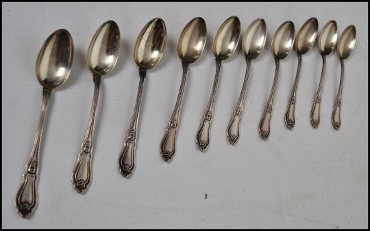 A set of ten silver tea spoons decorated in a Monte Carlo style pattern having sloped terminals and shoulders. Each stamped 800 with makers mark. Total weigh 111 grams. Measures 12cms long.