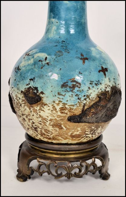 A 19th century Chinese / French table lamp in the manner of Theodore Deck. The brass ormulu mounted socle plinth supporting a stunning Chinese baluster vase with embellished detailing having lamp collar and screw atop