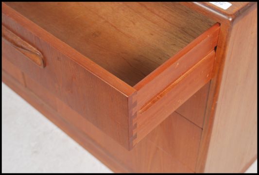 A 1970's G-Plan teak wood Kelso Pattern double chest of drawers being raised on an inset plinth with upright bank of drawers having recessed handles. Measures 76cm high x 142cm wide x 44cm deep.