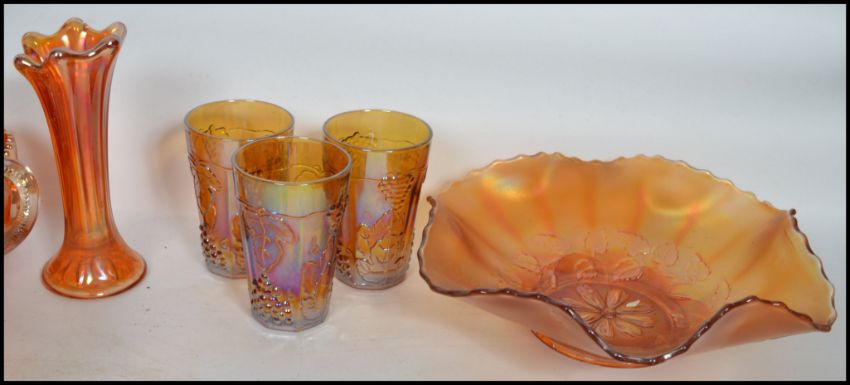 A good collection of vintage 20th century studio art carnival glass to include vases, set of six beakers, bowls, twin handled pot, scalloped rimmed dishes etc. Please see images.