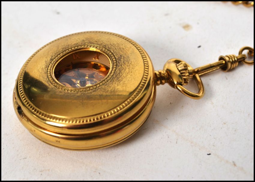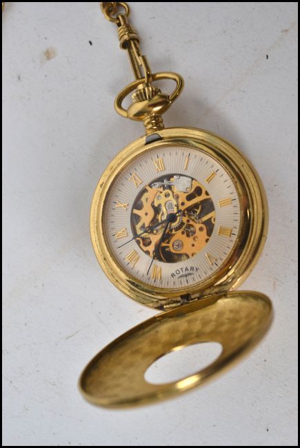 A contemporary 20th century Rotary half hunter open movement pocket watch complete with yellow metal attached fob chain.