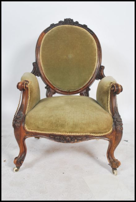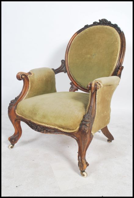 A Victorian 19th century walnut spoon back armchair raised on lavishly carved cabriole legs and castors with scroll arm rests, the upholstery is in an emerald green cotton velvet with detailed carved show wood frame