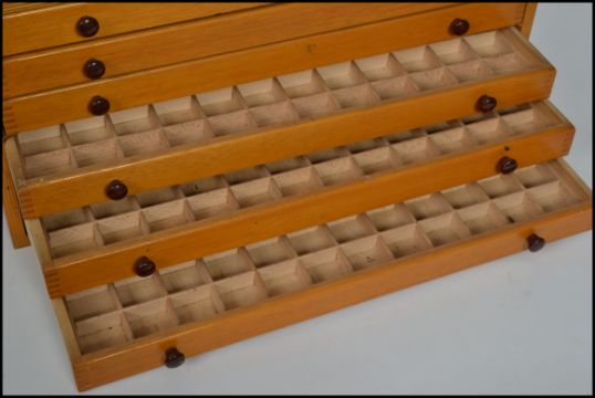 A vintage 20th century pine specimen / tools cabinet having multiple pull out drawers with handles.