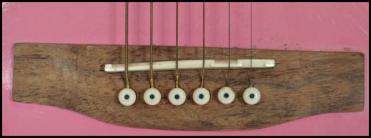 A vintage acoustic 6 string guitar in pink by Fisherman model FSF-PK having a shaped hollow body with label to interior.