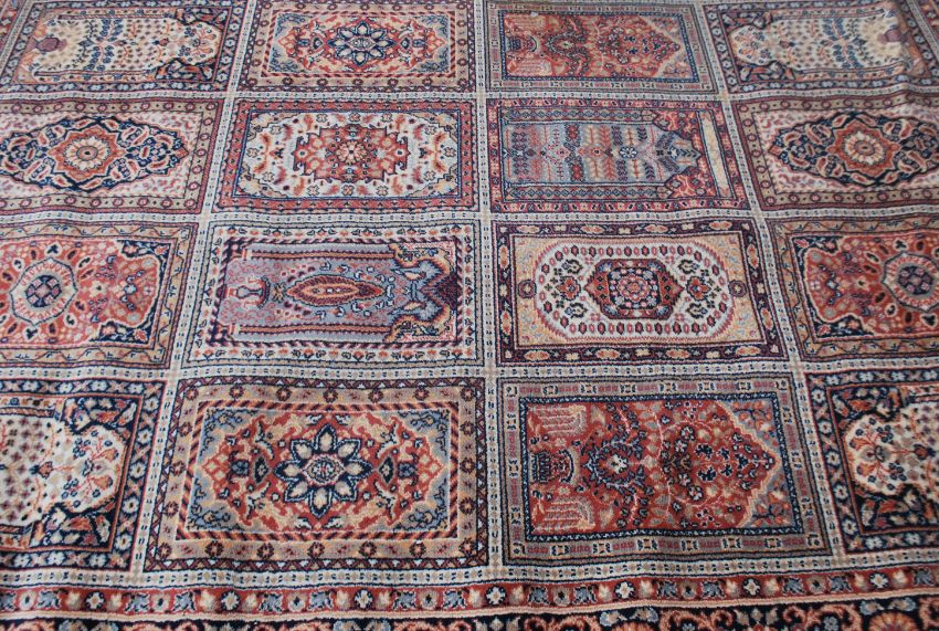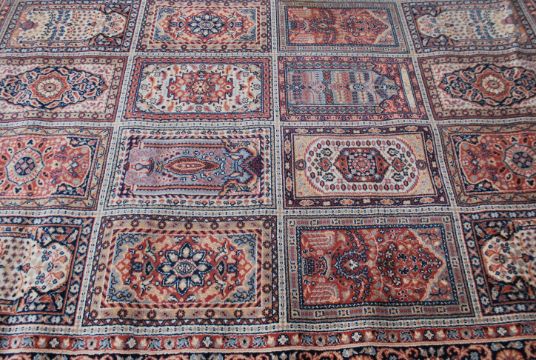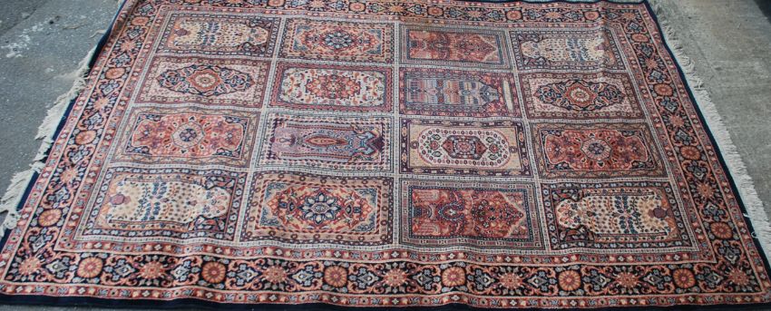 A large 20th century Persian / Islamic floor carpet rug having geometric medallions and spandrels. Measures 290cms by 200cms.
