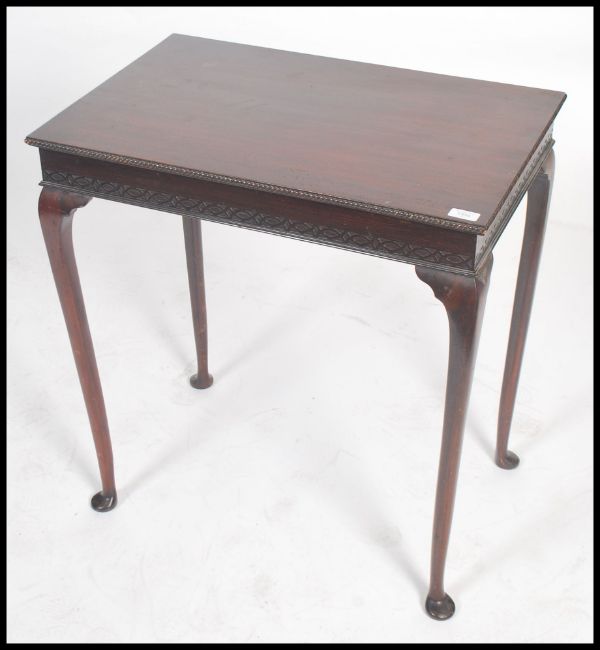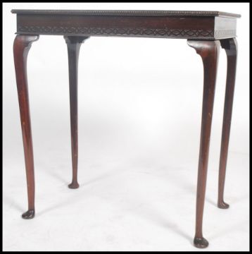 An early 20th century mahogany side / lamp table raised on cabriole legs with pad feet having a blind fret pierced frieze with rectangular top above