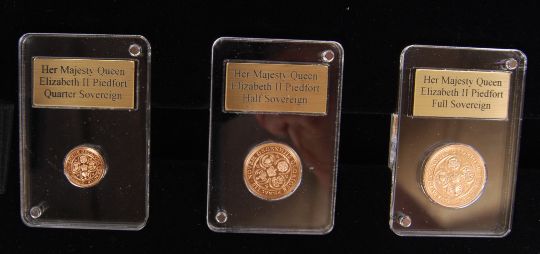 An incredible London Mint Office issued ' Her Majesty Queen Elizabeth II 90th Birthday Piedfort Sovereign Set .' Comprising of the following proof Gibraltar issued sovereigns; Five Sovereign (22ct, 79.88g), Double Sovereign (22ct, 37.96g), Full Sovereign (22ct, 15.96), Quarter Sovereign (22ct, 3.98g), and a Half Sovereign (22ct, 7.98g). Within the deluxe dual-layered presentation case. With all certificates and related paperwork. Total coin weight; 145.76g.