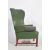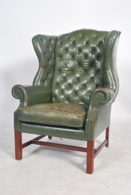 A superb 20th century, Edwardian / 1920's style full grain leather Chesterfield armchair. Raised on mahogany square tapering legs with an H stretcher and having a tall and deep wingback frame upholstered in a deep green button backed leather upholstery.