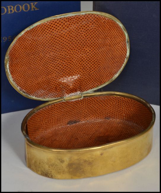 An early 20th century First World War trench art brass lidded pot with snakeskin lining.