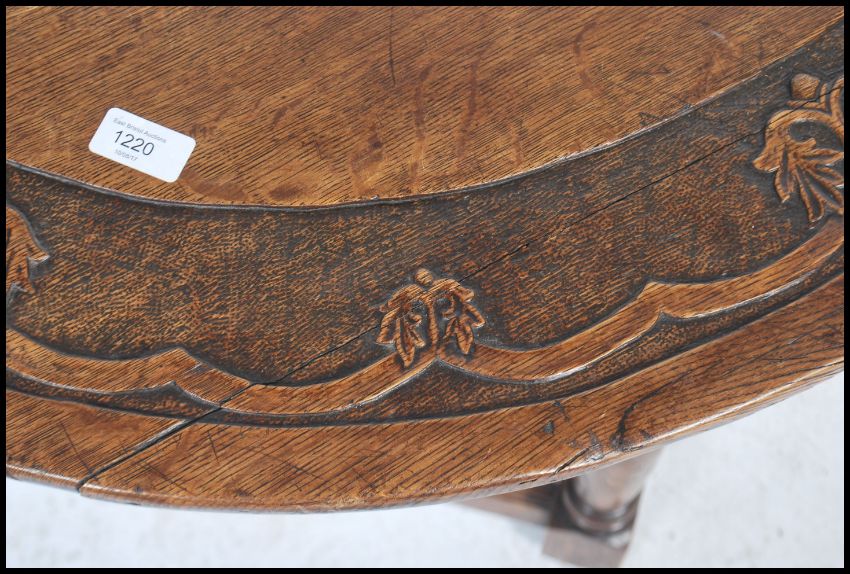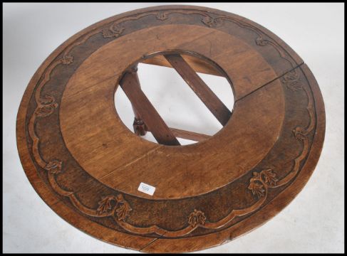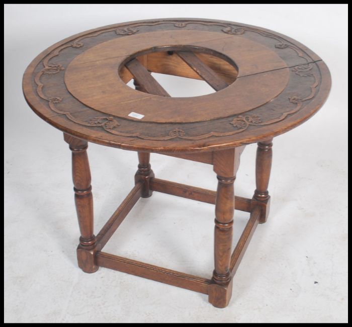 An unusual carved oak Victorian centre table being raised on block and turned legs with peripheral stretchers above a circular top with carved borders having a pierced centre to allow for marble - plant pot, bowl etc