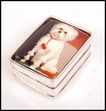 A silver rectangular pill box with a hinged enamel top having pictorial scene of a West Highland Terrier - Scottie Dog. Total weight 20.4g approx / size 3cms