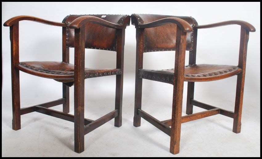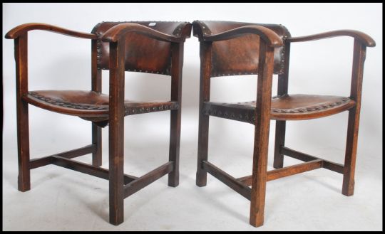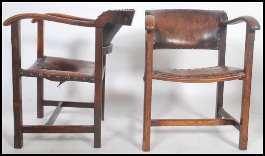 A pair of  bentwood oak art deco dining chairs having full grain brown  leather upholstered seats and back rests. Raised on squared supports.