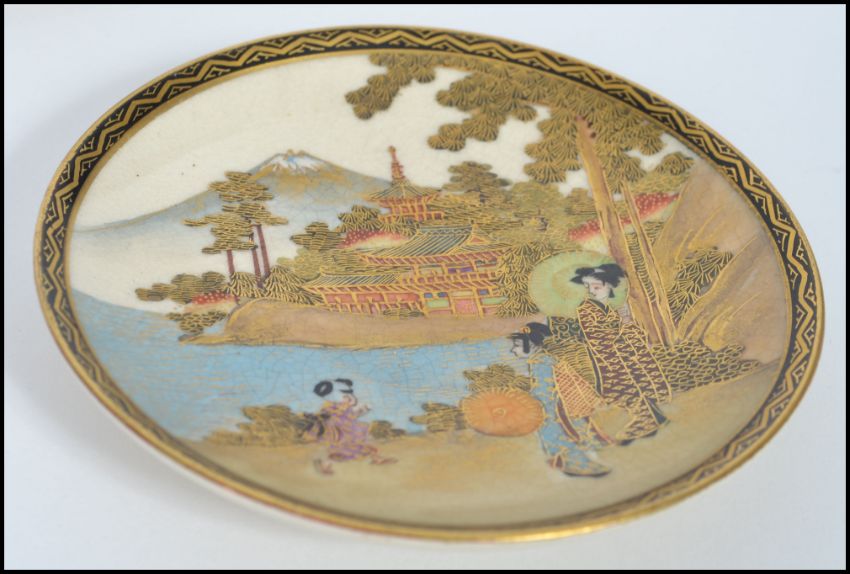 A matching set of four 19th century Oriental Meiji period Japanese Satsuma coffee cups / cans and saucers being hand painted with scenes of Geisha's and temples with gilt decoration and rims. Black and gilt character marks to base.