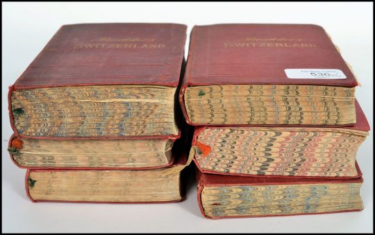 A collection of six 19th century Baedeker guides each with maps to the inners with guides for Paris, Allemangne, Northern Italy, Southern Italy and two for Switzerland.