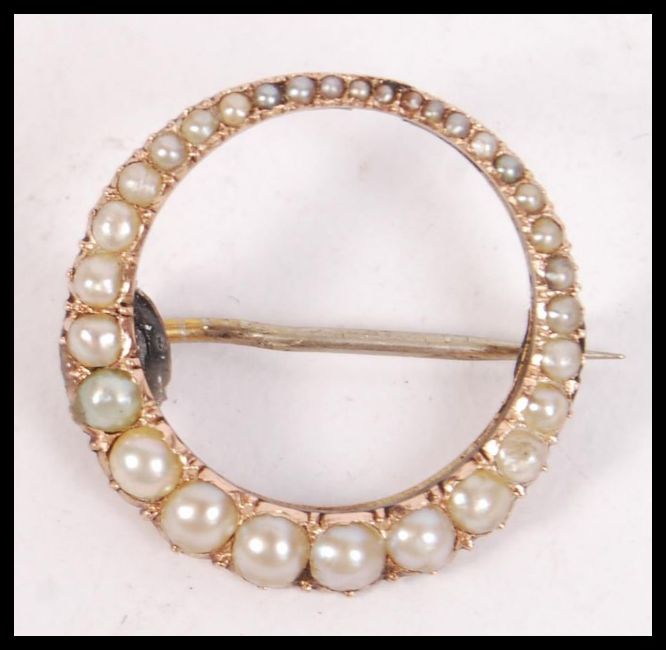 A 9ct gold and seed pearl adorned ladies vintage brooch of roundel form with graduating seed pearls with pin verso. Total weight 2.7g / Size 2.5cms diameter