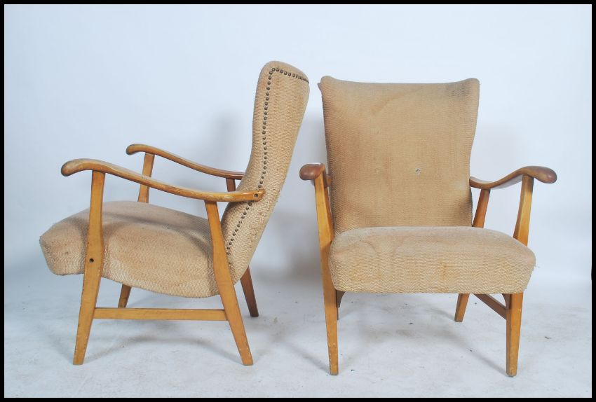 A pair of vintage mid 20th century his and hers open framed elm armchairs, having a button back chintzy fabric raised on tapering angular supports.