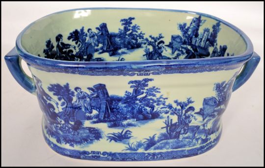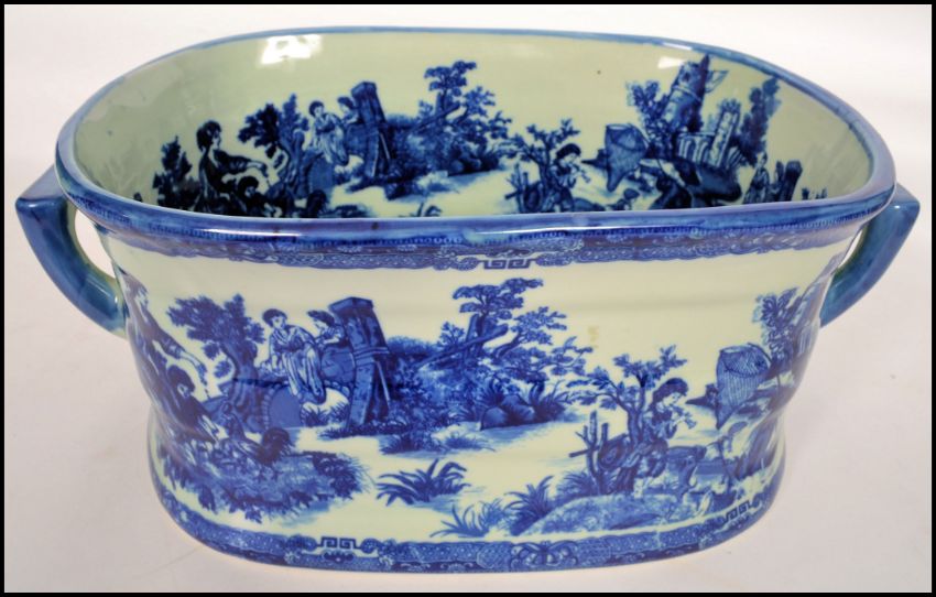 A large Victorian style blue and white willow pattern foot bath - planter having decorative scenes to the deep lozenge shaped bath with handles at each end